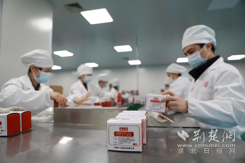 接到生产任务当天,劲牌公司连夜从安徽亳州紧急调运药方中两味库存不足的药材,次日开始投料提取、分离、浓缩、干燥、制粒、包装,3天时间赶制完成,并全部免费捐赠配送给省防控指挥部指定的基层治疗点。